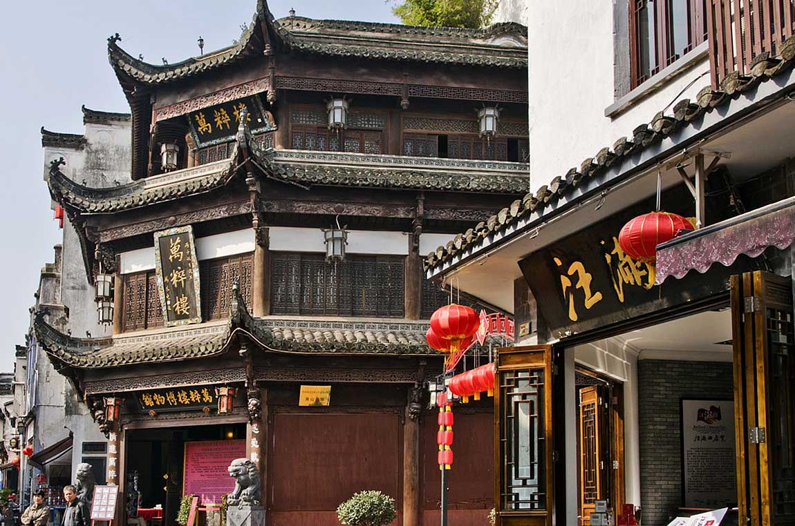 特別是老街兩側(cè)店鋪門楣上流光溢彩的金字招牌,古色古香,不少出自王朝聞、啟功、沈鵬、亞明、唐云、林散之、黃苗子、費新我等書壇魁星之手,還有省內(nèi)名家和地方書法精英的墨跡。“三百硯齋”擁有吳作人、沈鵬、羅工柳、劉炳森四位大師題寫的匾額,可謂匠心獨具,體現(xiàn)了徽商講求仁德的“儒商”經(jīng)營理念。