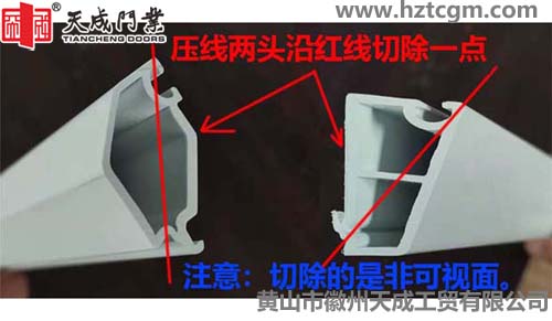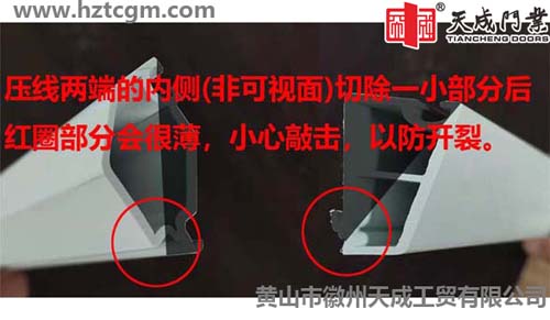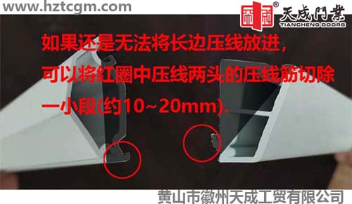 切除兩端內(nèi)側(cè)斜角后,有些壓線還是無法放入壓線槽,我們可以再將壓線兩端的壓線筋切除一小部分(兩端各10-20mm),就可以輕松將小片玻璃的長邊壓線放進(jìn)玻璃壓線槽了。
